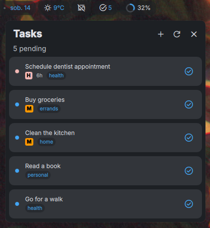 Display up to 5 timezones on the DankBar. Toggle between showing all at once or cycling one at a time at a configurable interval.