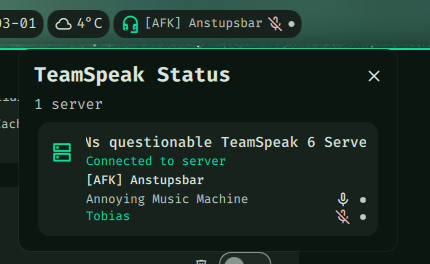 Clone the plugin repository into your ~/.config/DankMaterialShell/plugins/ folder and restart your dms session with dms restart. NOTE: Some plugins may have additional dependencies that need to be installed manually, please refer to the plugin documentation for more information, some plugins are part of a monorepo and need to be installed by copying the relevant path to the plugins folder.