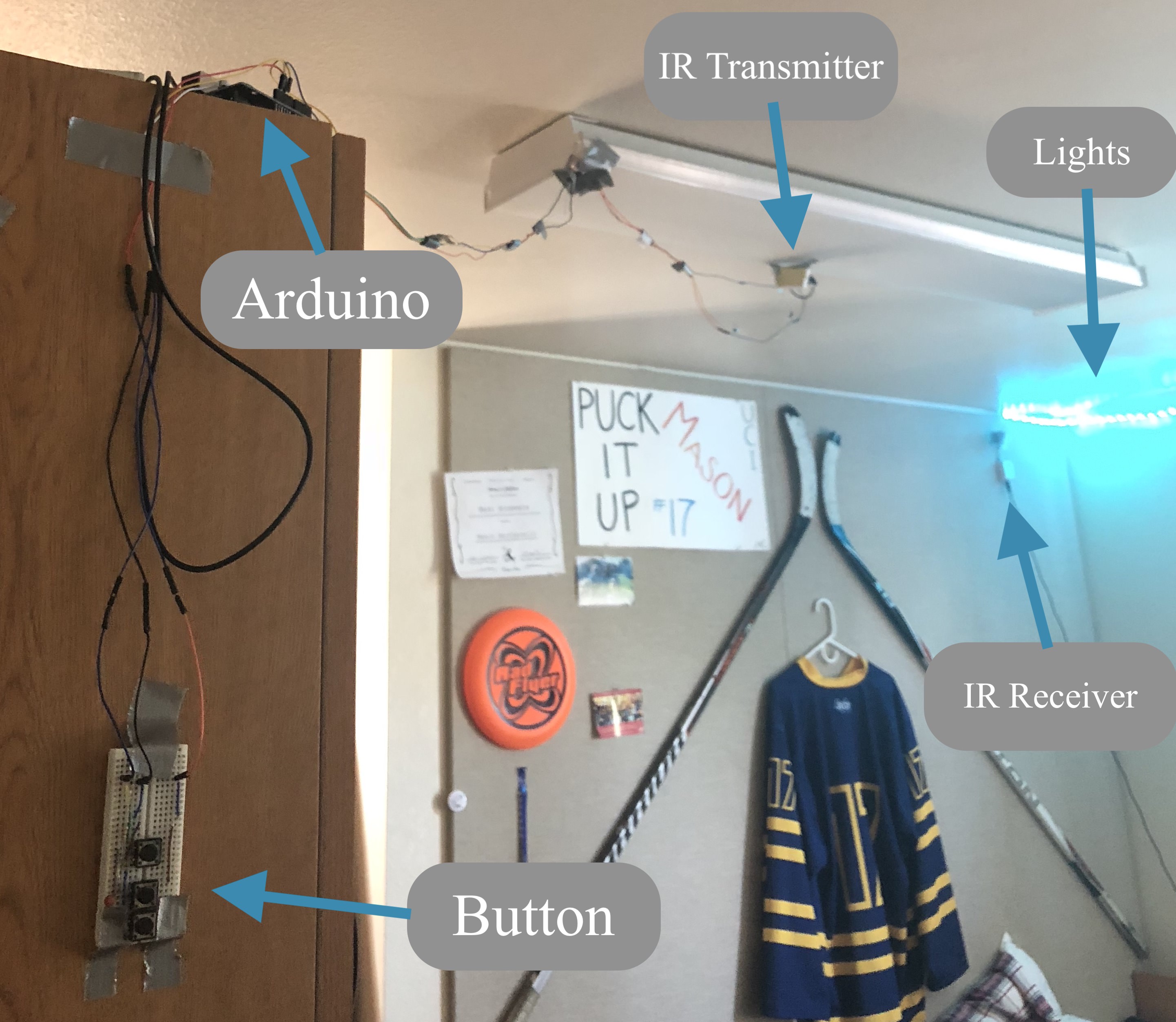 Using an Arduino with a button, audio output, and an IR transmitter, we wired up the party mode button. With the press of the button, the music would start playing and the IR transmitter would send a signal to activate the lights.We could program the transmitter to send out different signals, turning the lights to any color or pattern that we wanted. Holding down the button would activate the secret mode along with special music ;)