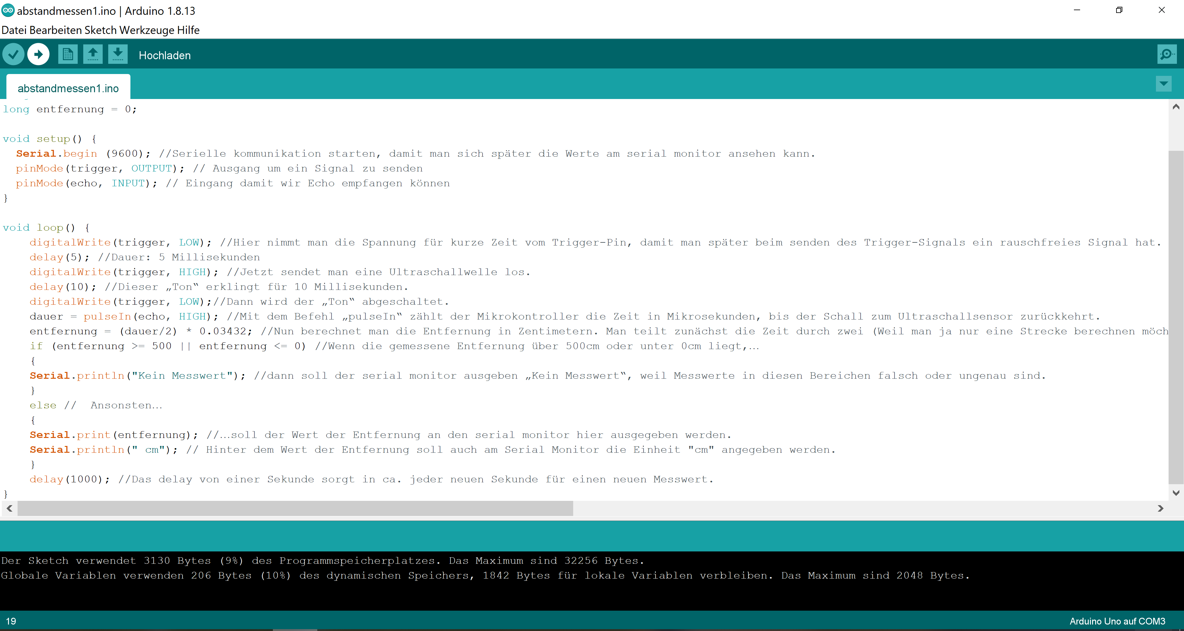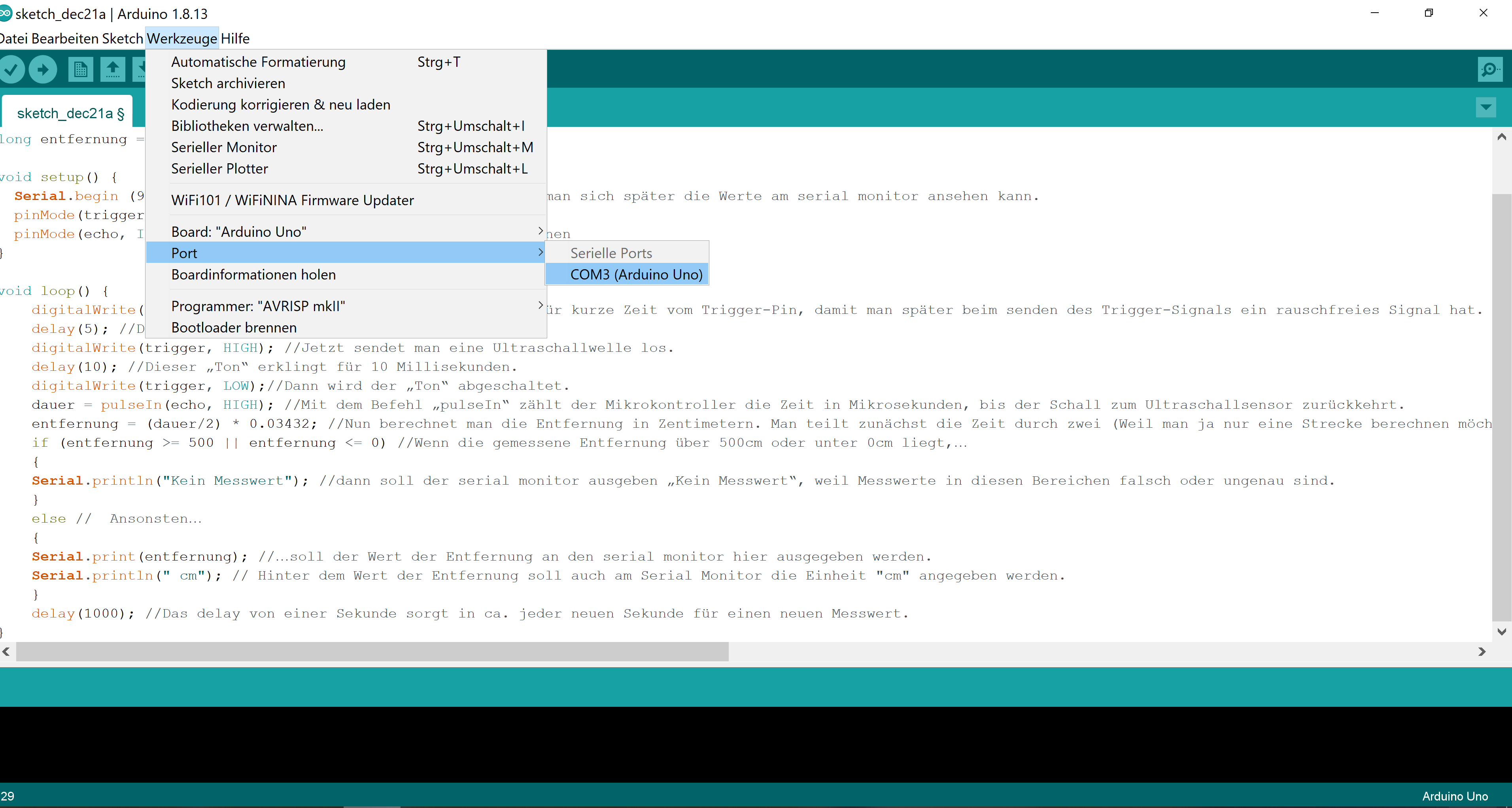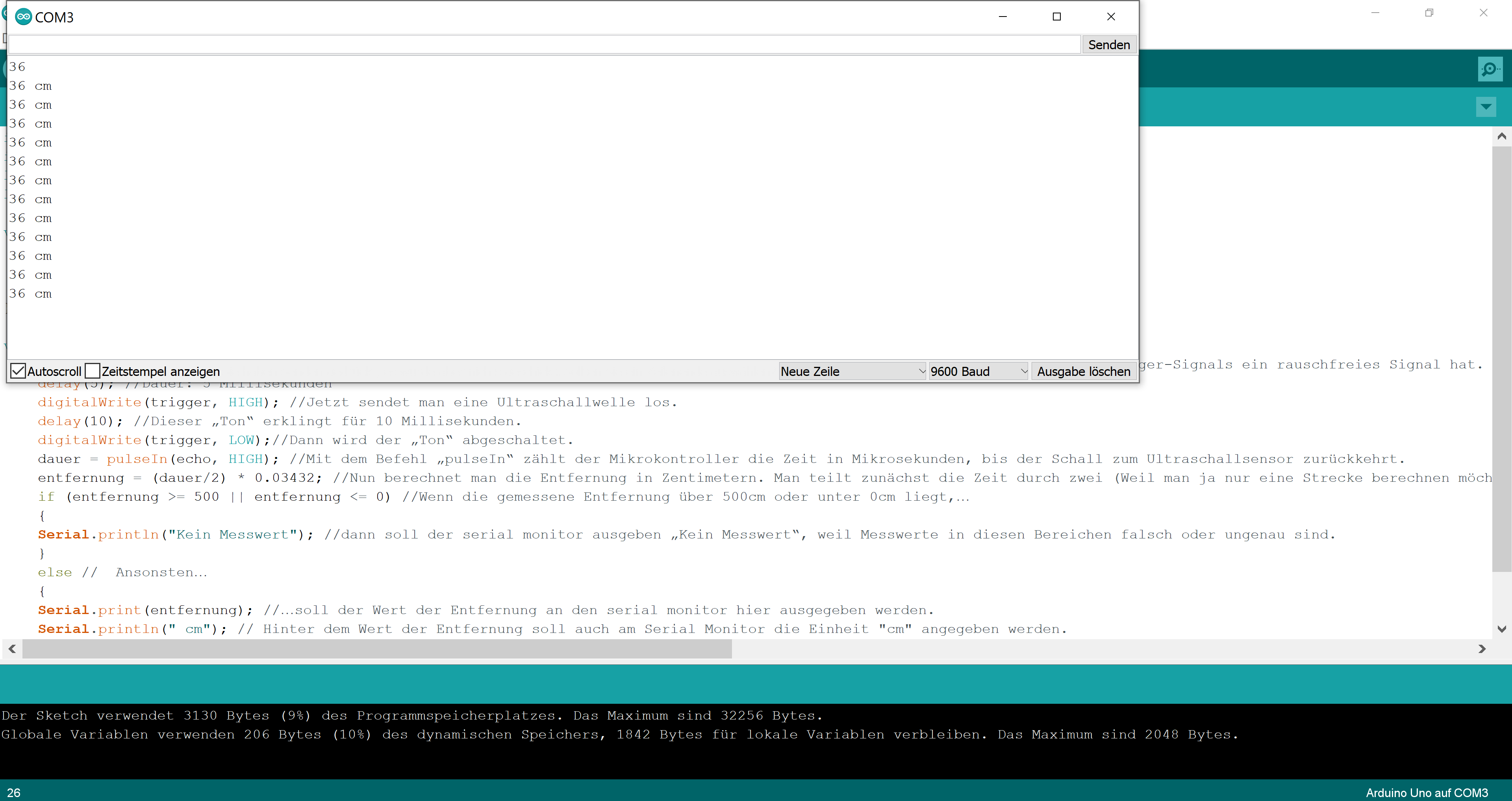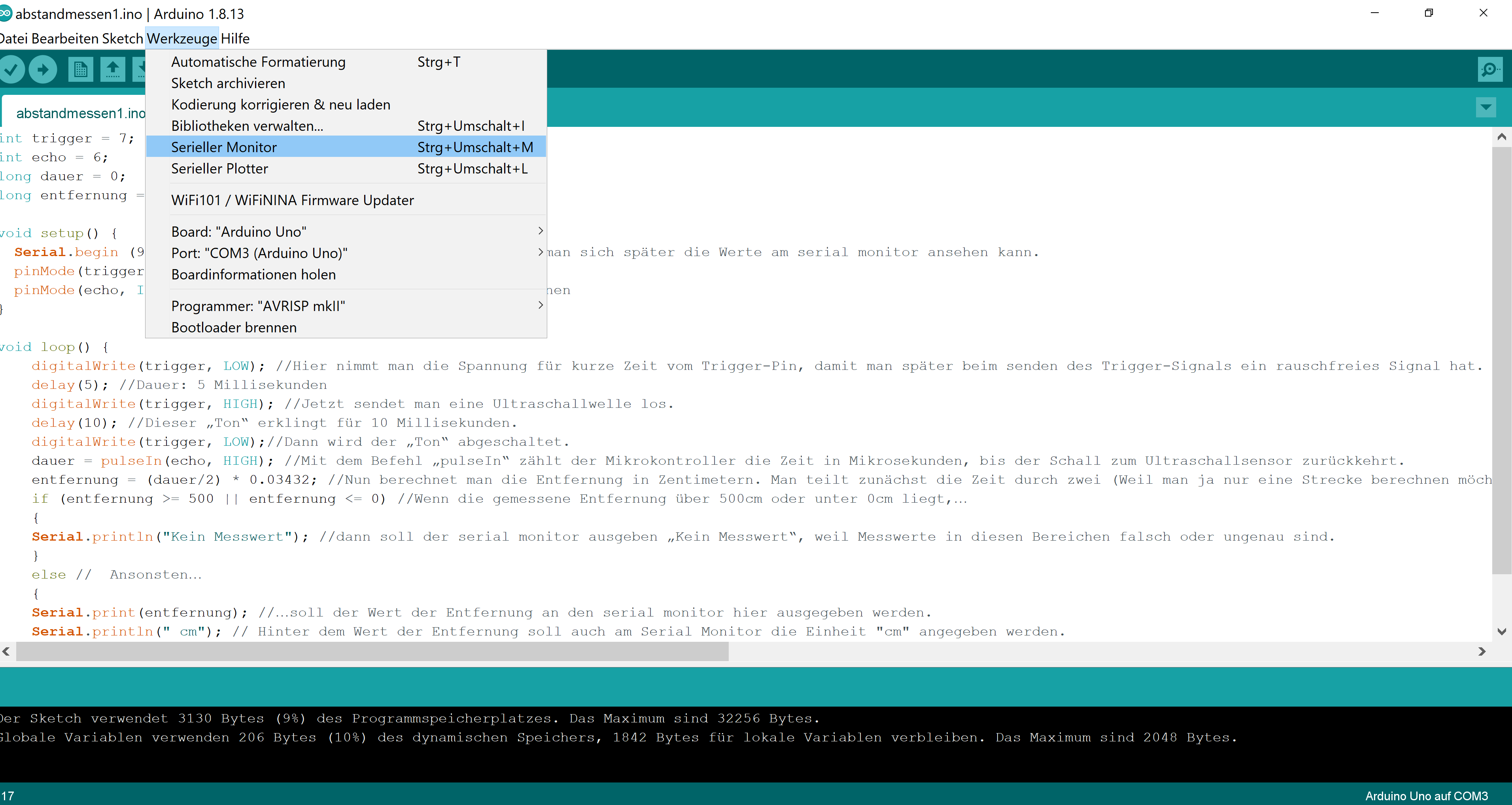 Super jetzt ist das Programm auf eurem Arduino! Aber wo sehen wir den gemessenen Abstand? Geht dazu unter Werkzeuge > Serieller Monitor