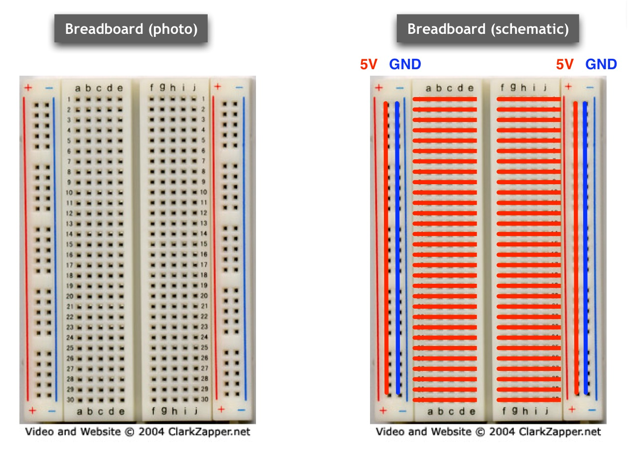 Jetzt geht es ans Verbinden: Dafür nutzen wir ein Breadboard. Dieses erlaubt es uns, ohne Löten mithilfe von Jumperkabeln die Komponenten zu verbinden. Dafür gibt es zwischen den Löchern intern Leitungen nach folgendem Schema: