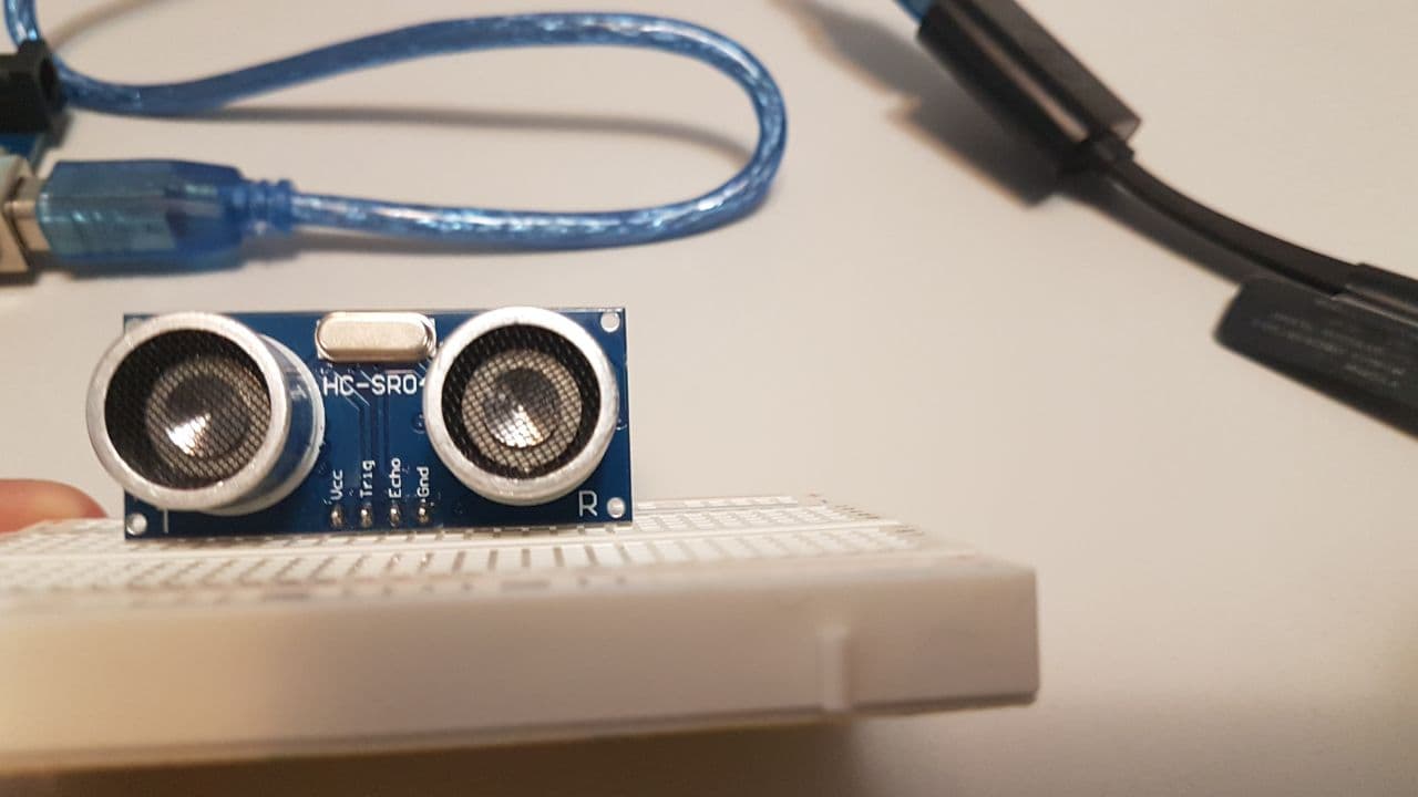 Du solltest zunächst keinen Ton hören. Wenn du jetzt etwas vor der Sensor hälst und dabei den Knopf drückst, kannst du einen Abstand einstellen. Wenn du danach etwas dichter an den Sensor hälst, als du vorher eingestellt hast, solltest du einen Ton hören.