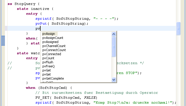 The State Notation Language is a superset of the C language, used for programming EPICS-based IOCs. The SNL perspective aids in editing through syntax highlighting, display of problems, code completion and outline-based navigation in the source code.