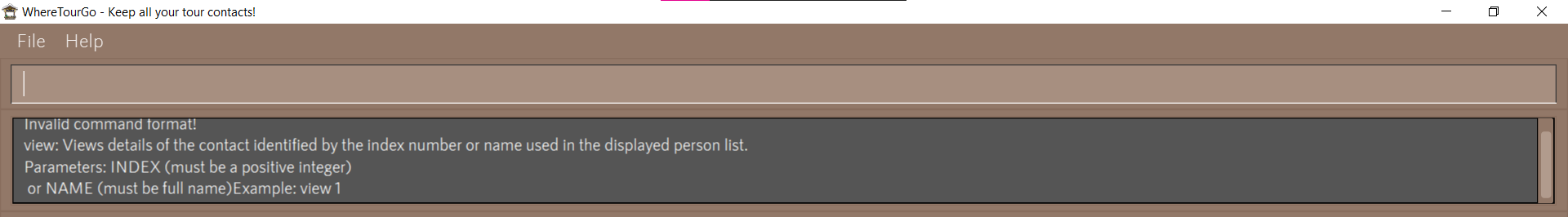 When I execute the command view -1, it shows the error message with accurate content. However, I notice that the _"example: view 1" is not in the next line which is slightly untidy. It would be better to move it to the next line :)