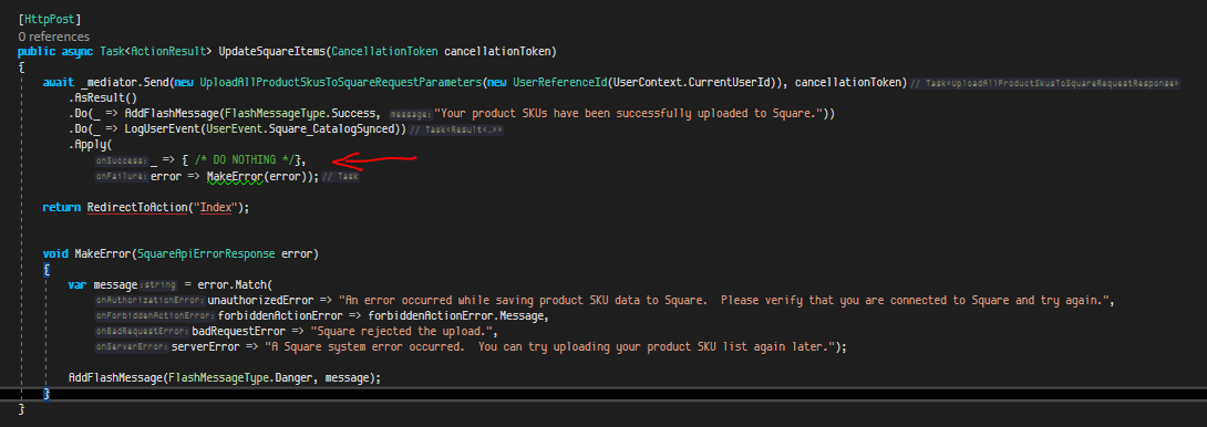 It's an interesting example you posted, I might suggest a refactor: Not that I believe you're referring in general to cases that always involve a Anyways, I lean towards adding Or maybe there is value in being that explicit? If so, I'd probably introduce an extension method |