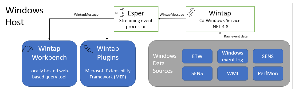 • API abstraction. Wintap integrates deeply into many low-level Windows event streams such as Event Tracing for Windows (ETW), COM+ System Notifications and others. Plugin authors can easily take advantage of these rich event sources without needing to implement any of the low-level API details.