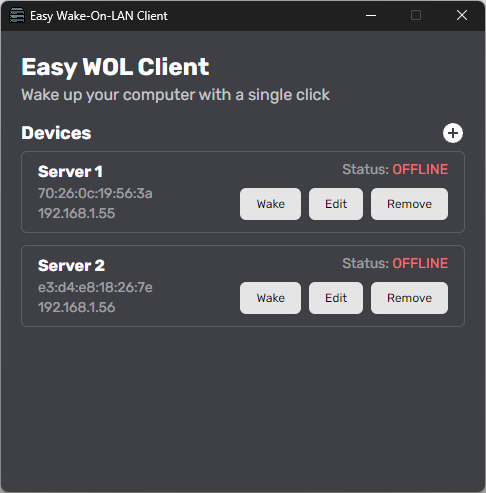 Easy WOL Client A simple and lightweight Wake-on-LAN (WoL) client to remotely power on computers in your network using their MAC address. Features Send Wake-on-LAN magic packets to remote devices. Lightweight and easy to use. Supports basic WoL configurations.