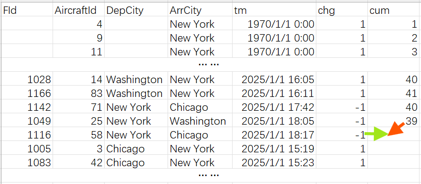 The times within each group of data are still sorted in descending order. The aircraft flew from New York to Washington and then back to New York, and did not leave New York before the last maximum value of cum appeared. It can be seen that if the chg of the first record in the group is 1, then this is a flight record that arrived in New York and did not depart.