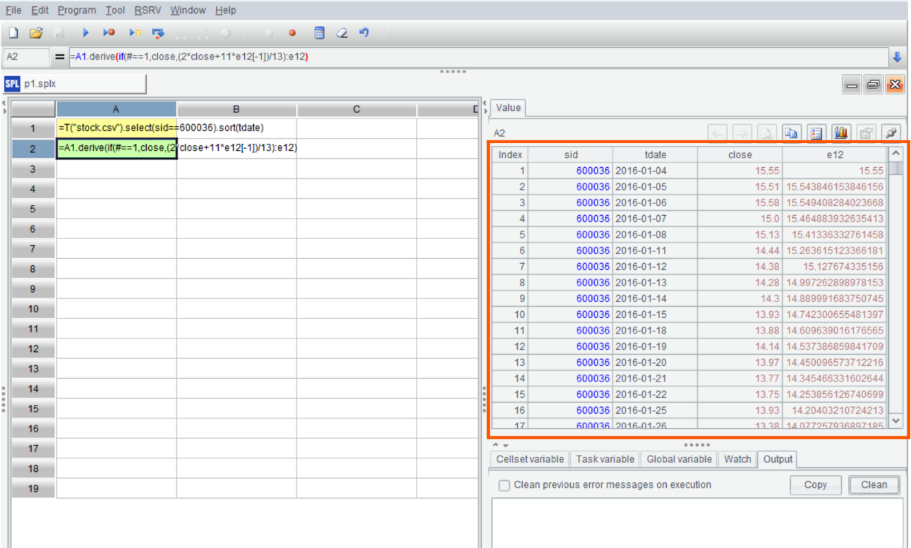 SPL supports cross-row referencing within looping functions. The e12[-1] in the expression represents the calculated e12 value from the previous row. # represents the current row’s sequence number during the loop calculation.
