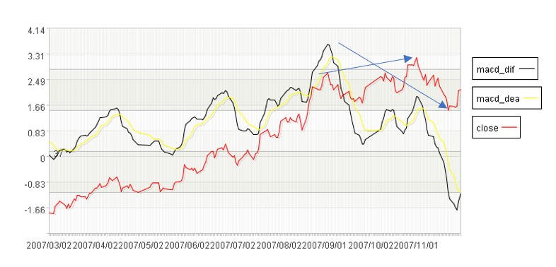 At the arrow position in the chart above, the stock price is still continuously rising, but the MACD indicator is diverging downwards, indicating top divergence.