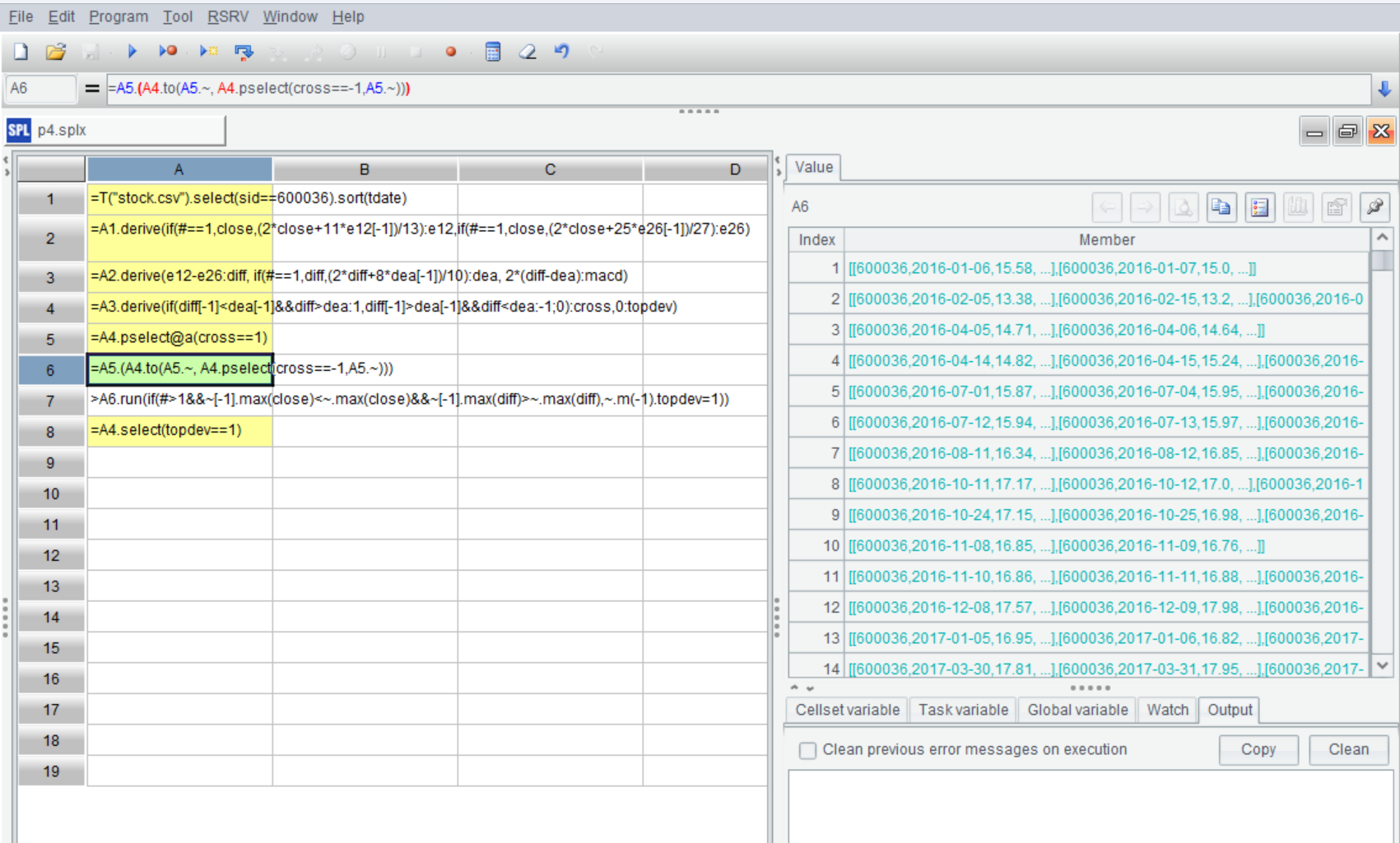 A6: Loop through the golden cross index positions in A5. A4.pselect(cross==-1, A5.~) will obtain the position of the first death cross after the given golden cross. In this way, the calculation result of A6 will be all golden cross to death cross intervals.