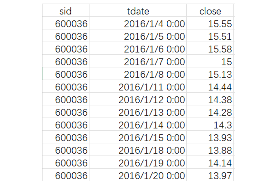 In which, sid is the stock code, tdate is the trading date, and close is the closing price.