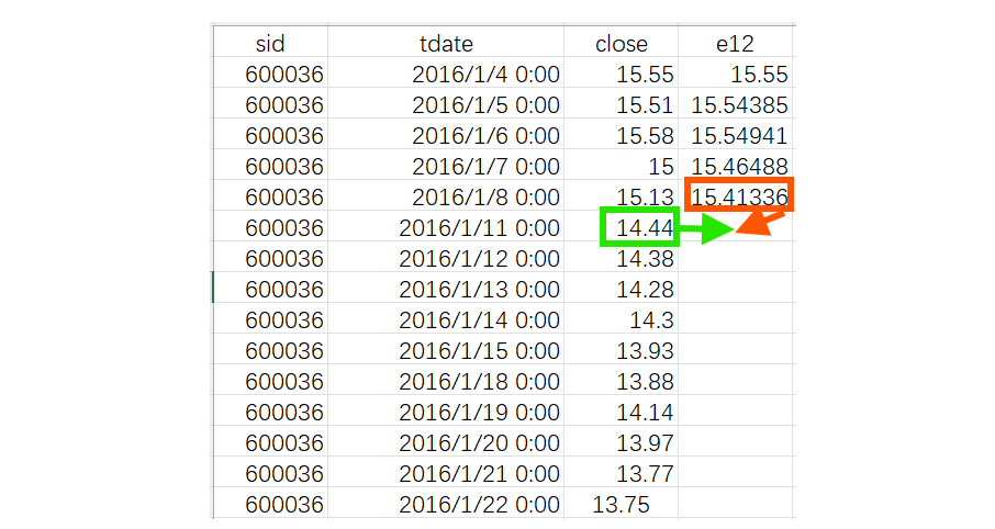 Now we need to calculate the 12-day EMA of stock 600036 for each trading day.
