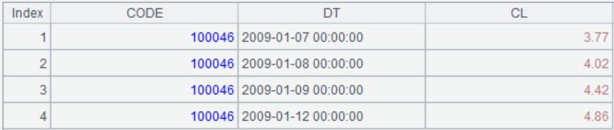 | 1 | =T("StockRecords.xlsx").select(CODE==100046).sort(DT) |
