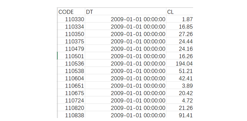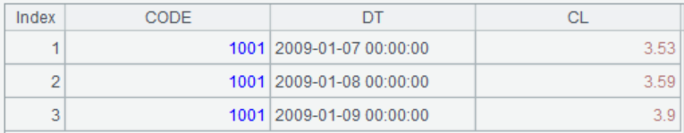 CODE is stock code, DT is transaction date, and CL is closing price.