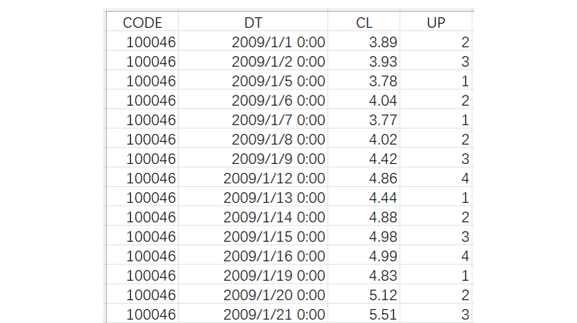 In fact, the task isn’t that difficult. The natural logical steps that are easy to think of are: sort the stock records by transaction date – each previous record is data of the previous transaction date; set a variable to store the number of consecutively rising dates, with the initial value being 1; compare each record’s closing price with that of the previous record, and add 1 to the variable if the closing price rises or reset the variable value as 1 if the closing price does not rise; store the variable value corresponding to each record in a new UP column, and we have the following table: