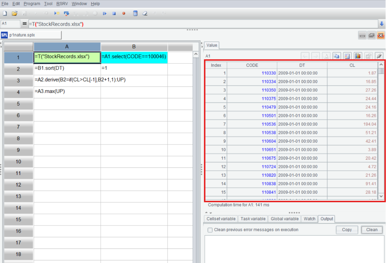 A1 reads stock data from the Excel file. SPL IDE is highly interactive, allowing step-by-step execution and intuitively checking result of each step on the result viewing panel on the right: