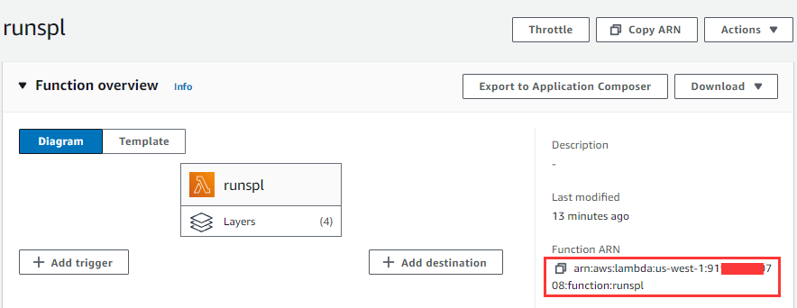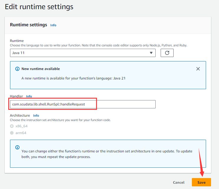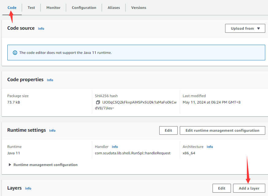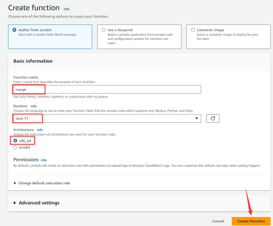 Enter runspl under “Function name”, select Java11 under “Runtime”, choose x86_64 under “Architecture”, and click “Create function” button to enter the page shown below: