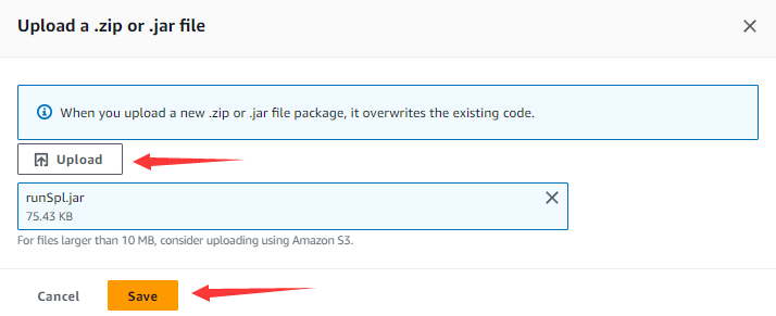 Click “Upload” button, choose the prepared runSpl.jar file and click “Save” button.
