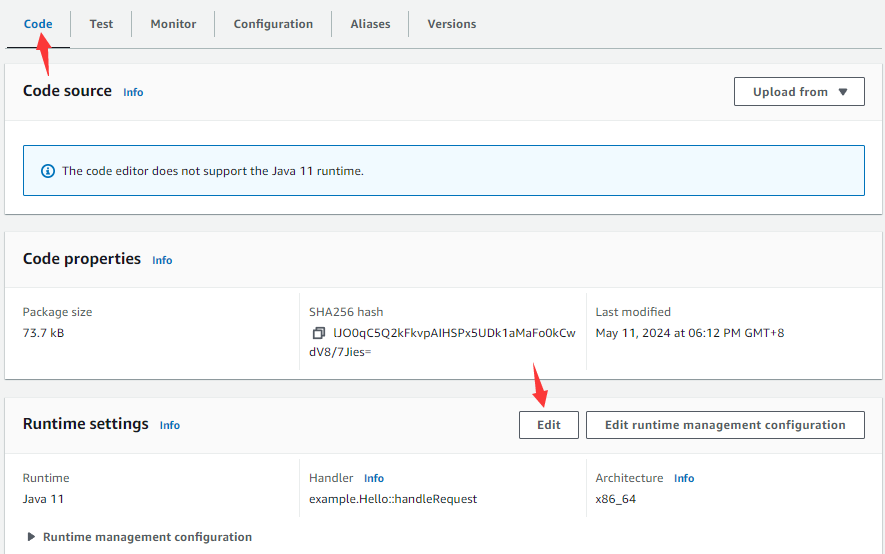 On the “Code” tabpage, click “Edit” button under “Runtime settings”: