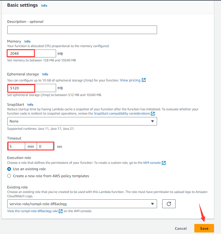 Edit Memory, Ephemeral storage and Timeout the function will use as needed (sizes of the first two items are related to the running costs AWS charges) and click “Save” button.