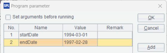 | 4 | =A1.open().cursor@m(O_ORDERDATE, O_ORDERSTATUS, O_TOTALPRICE;O_ORDERDATE>=A2 && O_ORDERDATE<=A3) |