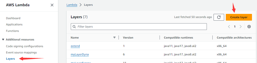 If the layer’s zip deployment package is changed, click the layer under “Layers” and then “Create version” button to re-upload the zip deployment package.