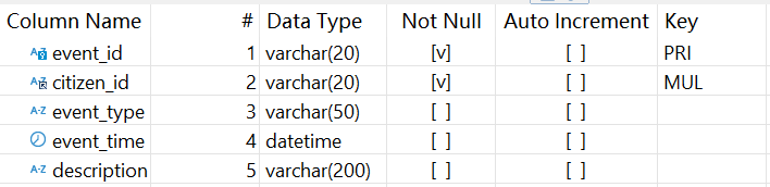 A citizen information system (DB_CitizenEvent) stores citizen-related information. The structure of the citizen_event table is as follows: