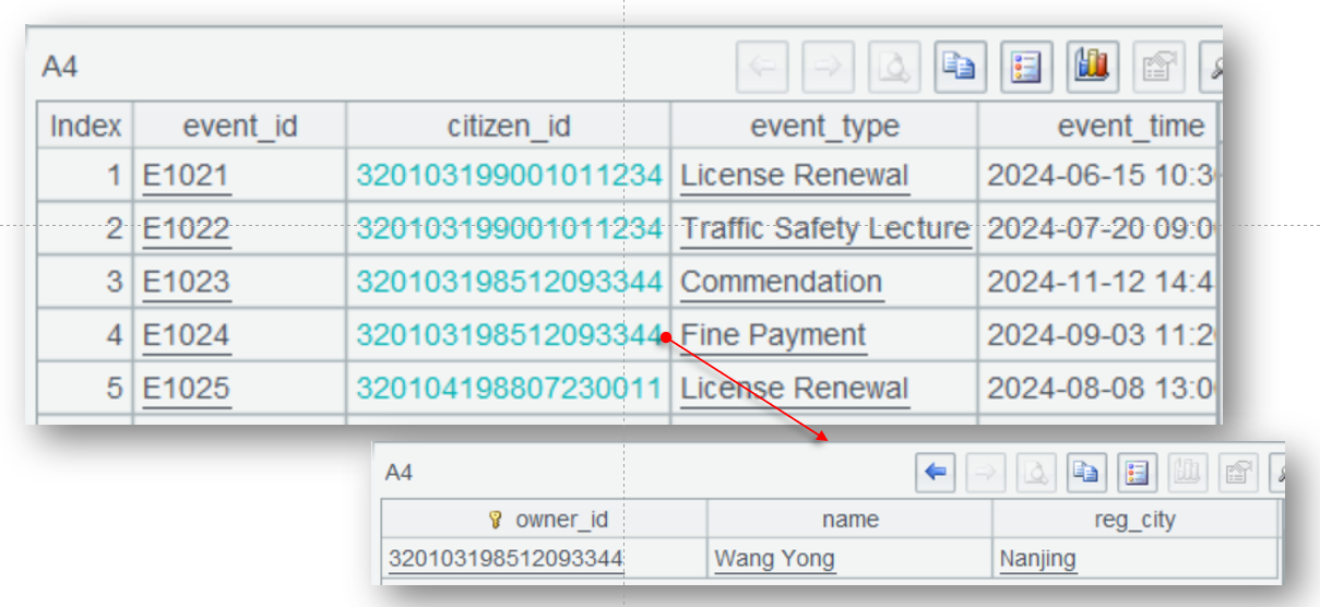 In daily practice, equality joins typically involve primary keys (many-to-many associations generally have little business significance). These joins can be broadly divided into two types: one is dimension table associations, where a common field of one table associates with the primary key of a dimension table (e.g., citizen_event and owner_info); the other is associations between a table’s primary key and another table’s primary key or part of primary key (e.g., vehicle_master and traffic_violation, where plate_no and violation_id of the traffic_violation table can be treated as a composite primary key, i.e., violation_id is subordinate to plate_no).