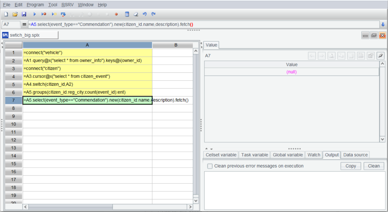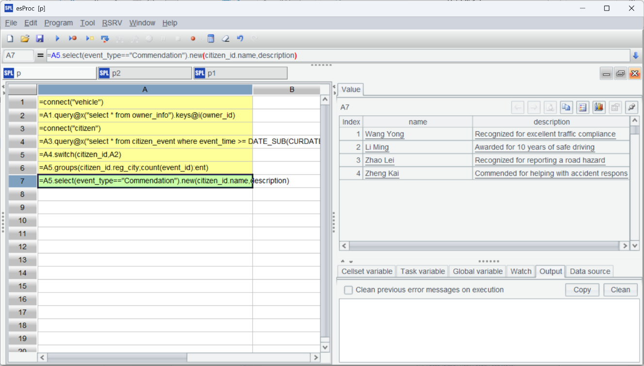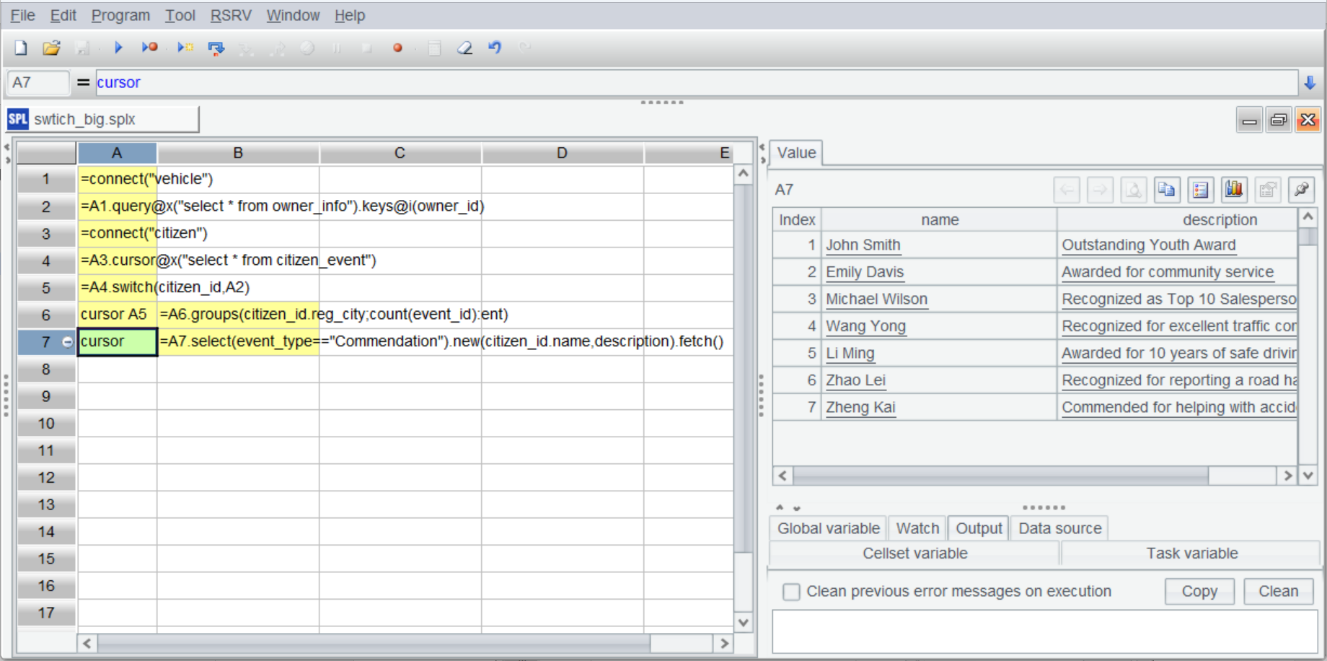 | 4 | =A3.cursor@x("select * from citizen_event") |