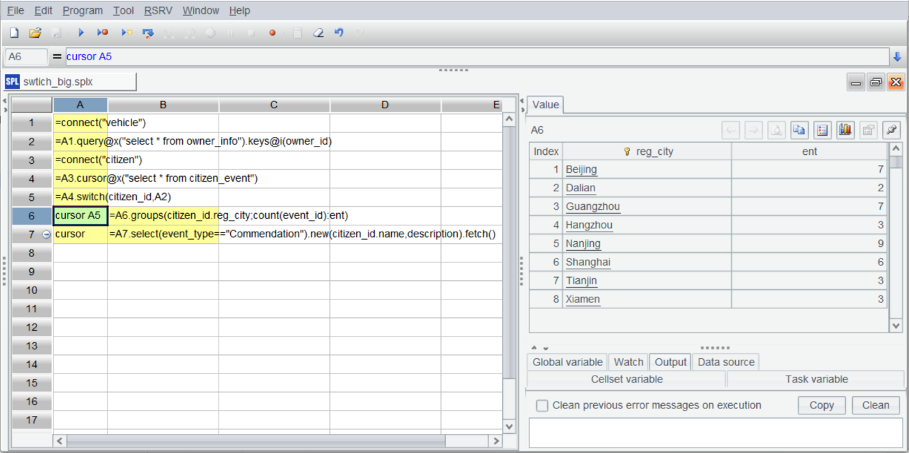 This transformation is a one-time operation, and the resulting data can be reused repeatedly. Moreover, it can simultaneously handle foreign key associations for multiple dimension tables. After association, any dimension table field can be referenced using the ‘association field. dimension field’ syntax. For instance, A6 uses citizen_id.reg_city to obtain registration cities for grouping and aggregation.