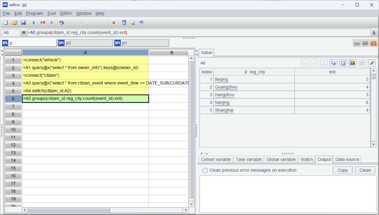 | 6 | =A5.groups(citizen_id.reg_city;count(event_id):ent) |