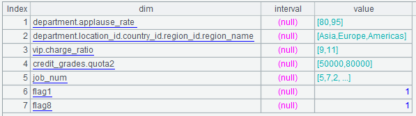 B27: if the “dim” of A10 is job_id, that is, job_id is an enumeration value, for example, ["AD_VP","FI_MGR","AC_MGR","SA_MAN","SA_REP"].contain(job_id). In this case, C27 converts the “dim” of A10 to job_num and C28 converts the enumeration value “value” of A25 to the position in the sequence of global variable “job”, i.e., job_num integer sequence. For example: [5,7,2,15,16].