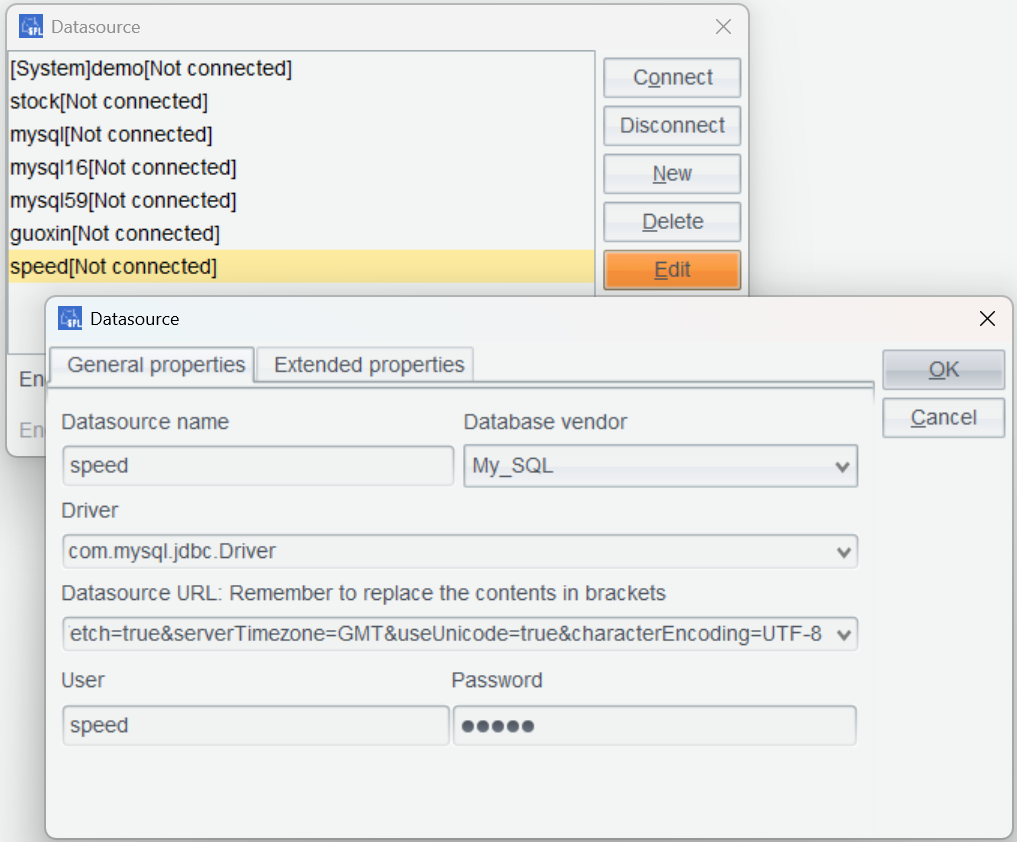 We use SPL’s ETL tool to generate a script to achieve data dump. Find dft.exe in [SPL installation directory ]\esProc\bin, run it, and select File -> New ETL. Open Tool -> Connect to Data Source: