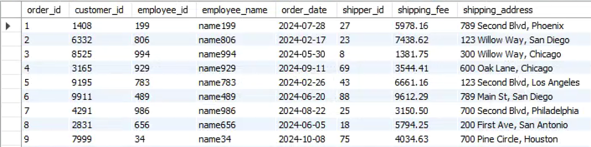 | 3 | =A1.cursor("SELECT order_id,customer_id,employee_id,employee_name,order_date,shipper_id,shipping_fee,shipping_address FROM orders ") |