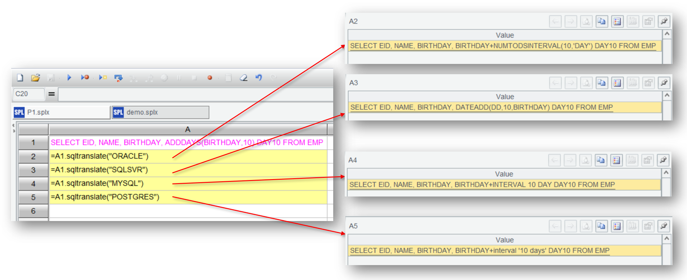 Let’s first try to perform the SQL translation in IDE by transforming SELECT EID, NAME, BIRTHDAY, ADDDAYS(BIRTHDAY,10) DAY10 FROM EMP to the SQL dialects of different databases.