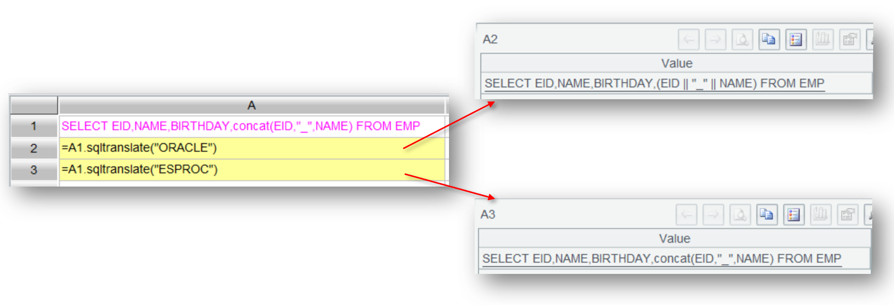 Later when you need to translate SQL statement SELECT EID,NAME,BIRTHDAY,concat(EID,"_",NAME) FROM EMP to the dialect of Oracle, the result would be:
