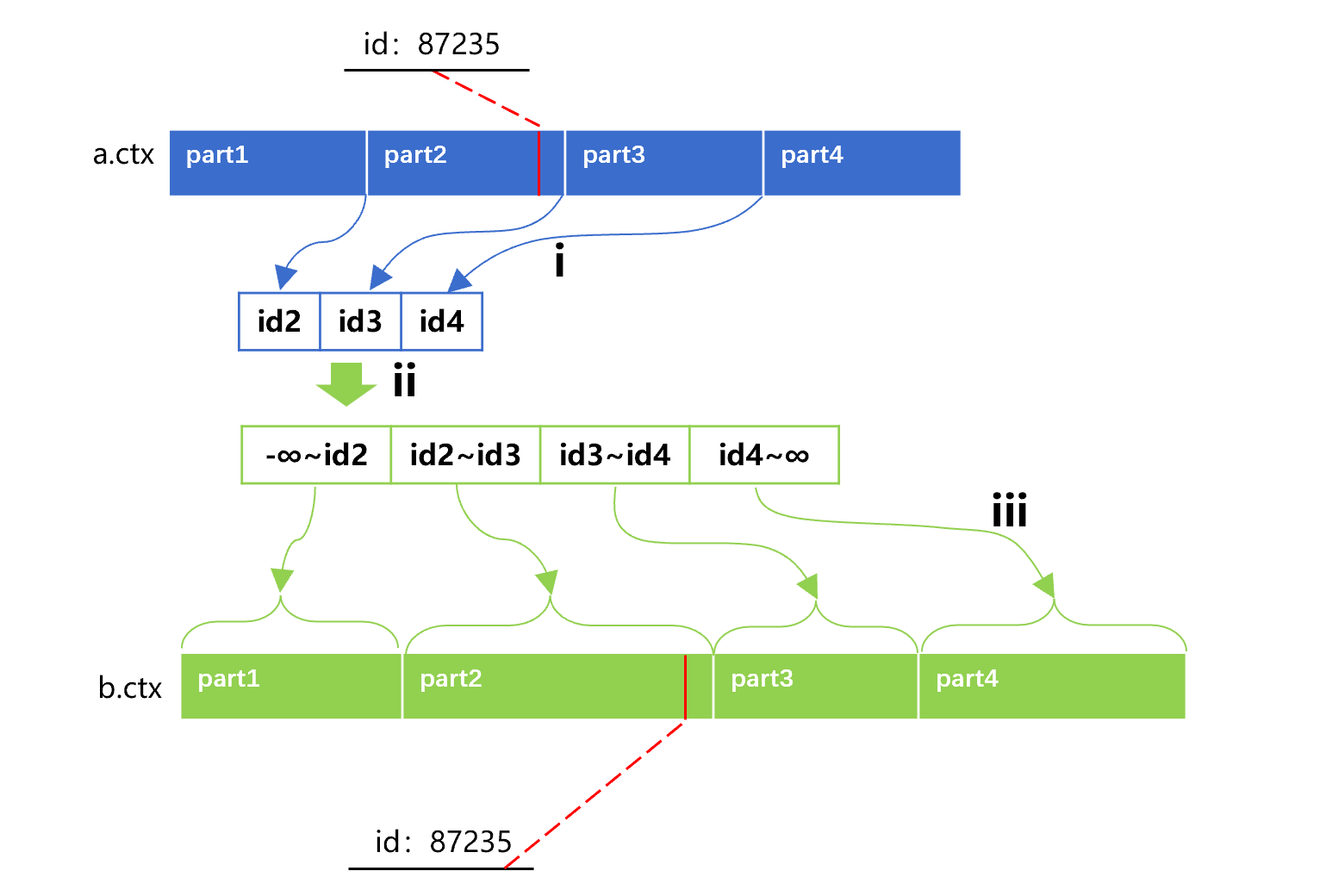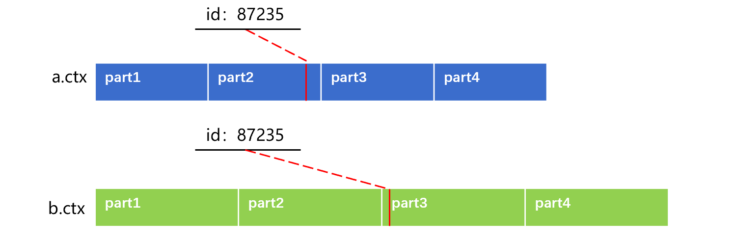 Take the record whose id is 87235 as an example. It falls within part2 of table a. That is to say, it is located in the part defined by id2 and id3. For table b, all its records whose id values are between id2 and id3 settle in part2, so its record where id is 87235 is definitely within part2. This makes correspondence synchronous.