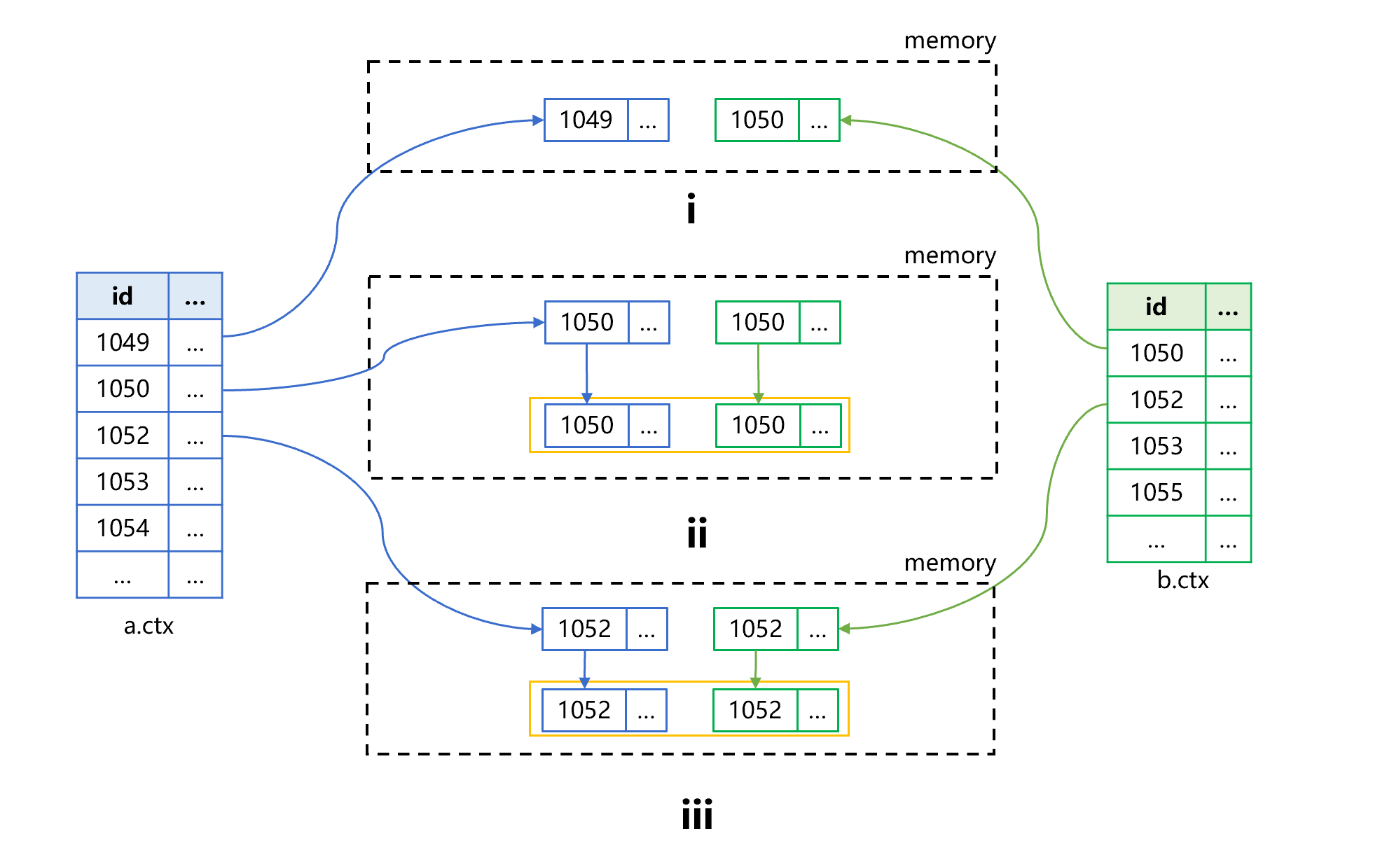 According to the figure above, step1 reads a record from each of the table into memory and checks whether their ids are equal. The first retrieval shows that table a’s id (1049) is less than table b’s id (1050). Step2 discards the first record of table a and reads the next record – this time the two records, with the same id 1050, match – and makes the two records the fields of a new record in the memory result set. Step3 retrieves records from both tables respectively and checks whether they are equal – again they are equal with the same id 1052 – and uses them to generate a new record for the memory result table.