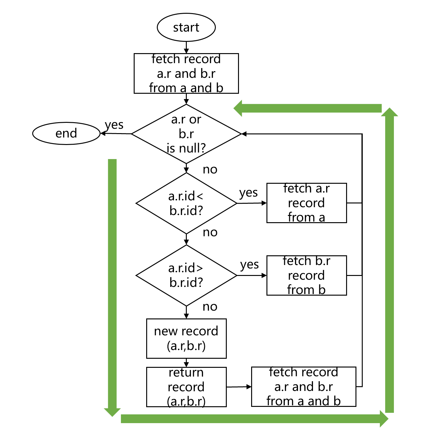 In this way, records are repeatedly retrieved, compared, and used for generating new records. The loop goes on and on until all records in one of the tables are retrieved. The loop runs like this: