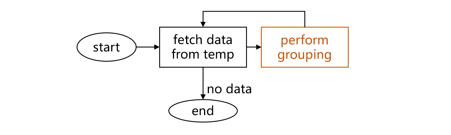One near-at-hand method is to store the intermediate result concretely by exporting result data to an external temp table. Then we perform grouping and aggregation on this temp table. The following figure shows the process of writing intermediate result set to the temp table: