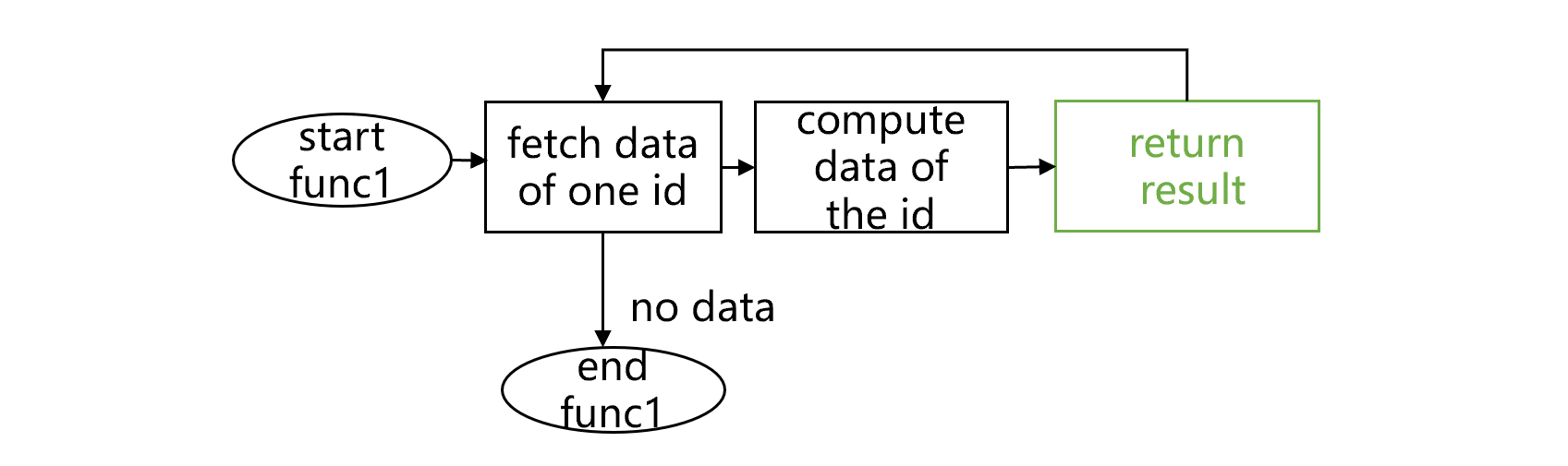 As the diagram shows, func1 returns result within a loop. Traditionally, an invoked subprogram is closed after it returns the result of computing the first subset.