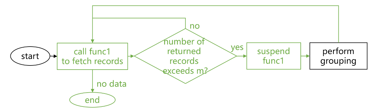 In fig5, the program cursor acts as an external program to invoke func1 and collect its returned results to form a cursor. When the grouping & aggregation operation in compute2 requests to fetch m records from the cursor, the program cursor mechanism begins to execute func1 and collect the returned results. Unlike regular subprogram invocation, func1 won’t be closed after it returns result (the step highlighted in green in fig4). If the number of records in the returned result set is less than m, loop of the subprogram continues; if the number reaches m, loop is suspended and result of the current fetching is returned.