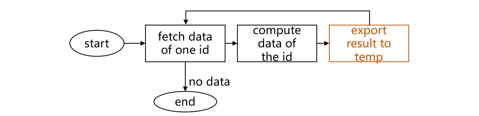 According to the illustrated workflow, a batch of records under the same account is retrieved from the account trading table, and eligible records are selected and exported to the temp table. The loop repeats until all records are retrieved, all eligible records are exported, and compute1 is wrapped up.