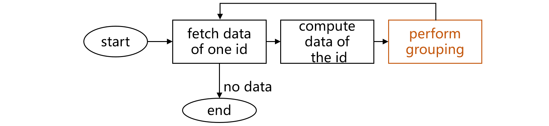 According to the above plan, the intermediate data won’t be exported to the hard disk but will be grouped directly instead. Yet there is a complication. The grouping function operates solely on table sequence or cursor. To implement this new part of computation, we have to resort to hardcoding for each batch of records. This is complicated. It is even harder to code the direct grouping & aggregation if compute2 involves a more complicated operation than grouping.