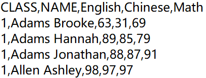 Example: students_scores.csv is a big file that records student scores. Values of different columns are separated by commas. Below is part of the file: