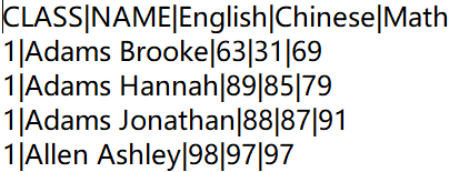 | 1 | =file("E:/txt/students_scores_.txt").cursor@t(;,"|") | Specify “|” as the separator |