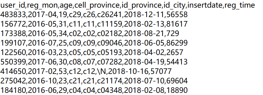 Example: The big file user_info_reg.csv records user login information. We want to calculate the total number and duration of user logins in each province. Values of different columns are separated by commas. Below is part of the file: