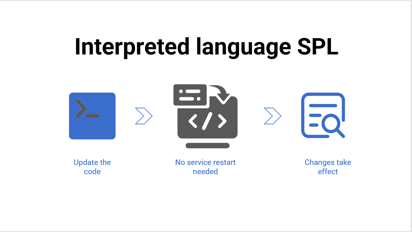SPL is an interpreted language that inherently supports hot swapping while power remains switched on. Modified code takes effect in real-time without requiring service restarts. This makes SPL well adapt to dynamic data processing requirements.