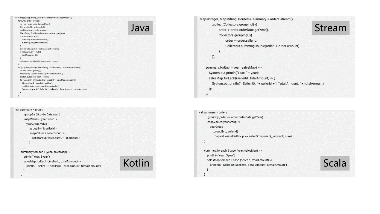 The Kotlin code is simpler, but the improvement is limited. There is still a big gap compared with SQL.